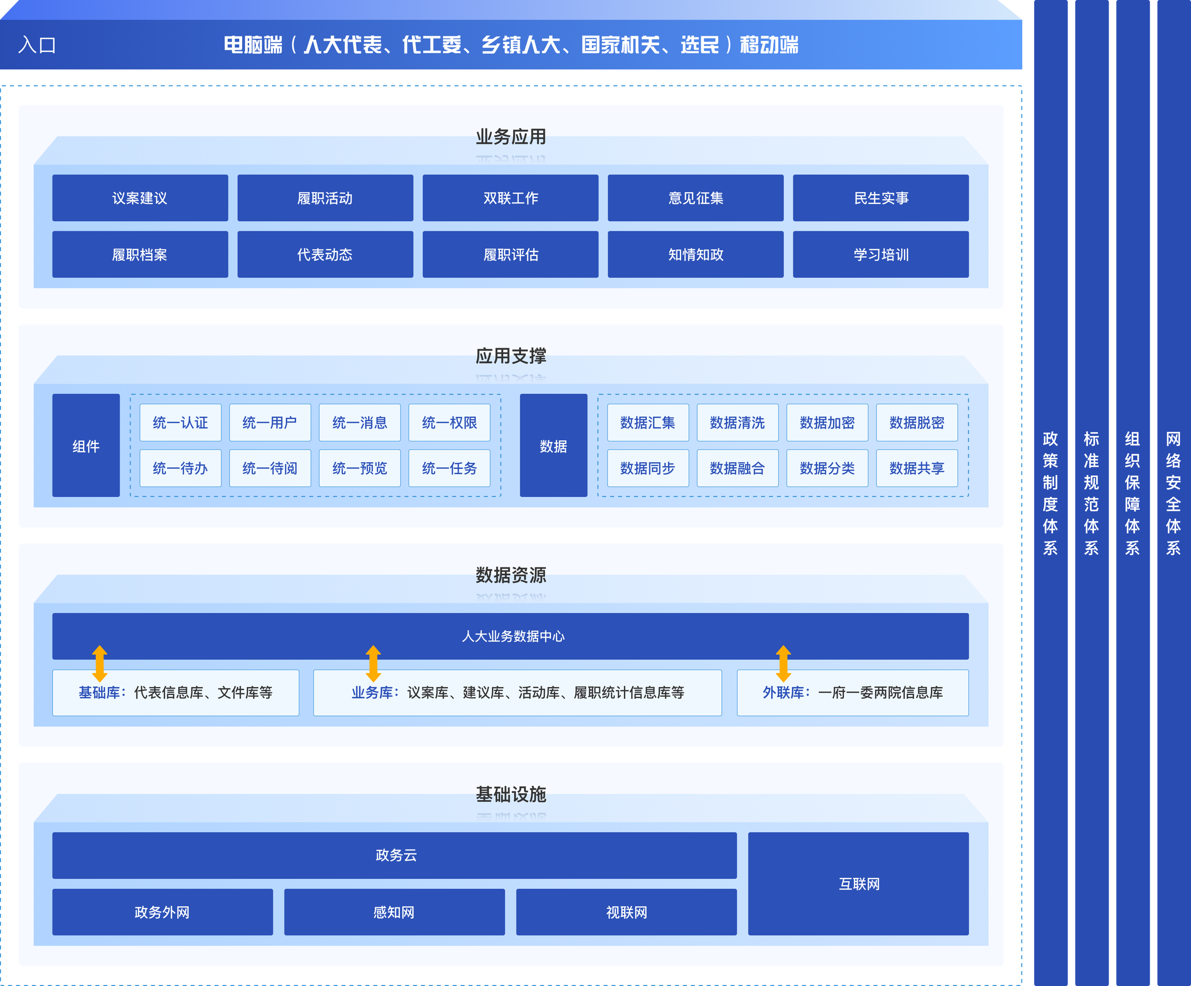 以“激发代表履职积极性,提升代表履职实效”为切入口,以“联系群众有温度、服务中心有高度、 推动工作有力度”为核心目标,打造国家、省、市、县、乡镇五级人大代表“全天候”的履职平台、 “全方位”的学习平台、“全联通”的监督平台,支持人大代表更好为政府建言、为人民代言、为 发展预言。